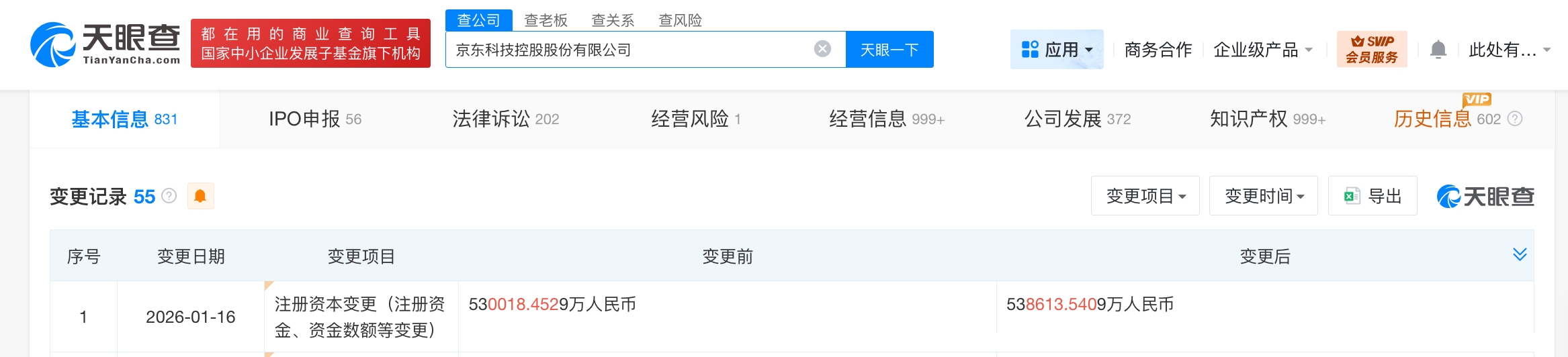 天眼查工商信息显示,近日,京东科技控股股份有限公司发生工商变更,注册资本由约53亿人民币增至约53.9亿人民币。