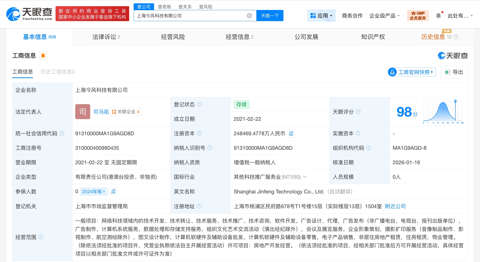 上海今风科技有限公司成立于2021年2月,法定代表人为司马拓,经营范围含网络科技领域内的技术开发、技术转让、技术服务、技术推广、技术咨询,软件开发,数据处理和存储支持服务,房地产开发经营等。股东信息显示,该公司现由北京字跳网络技术有限公司、矩阵空间(香港)有限公司共同持股。
