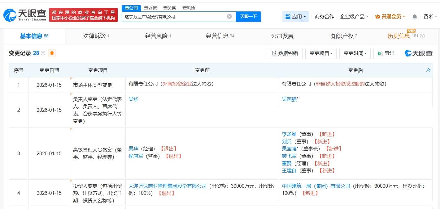 天眼查工商信息显示,近日,遂宁万达广场投资有限公司发生工商变更,原股东大连万达商业管理集团股份有限公司退出,新增中国建筑一局(集团)有限公司为全资股东,吴华卸任法定代表人,由吴国强接任,同时多位主要人员发生变更。