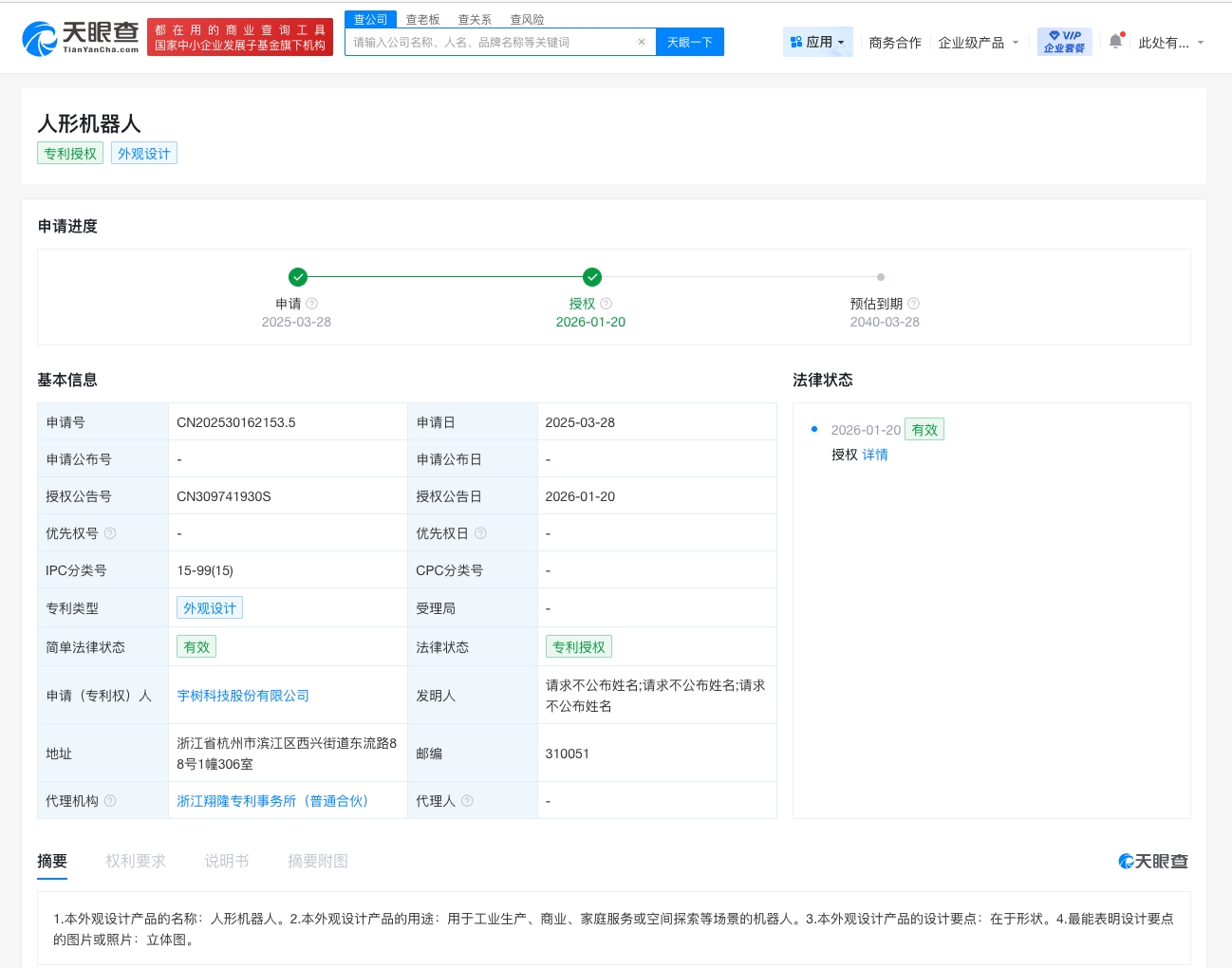 天眼查知识产权信息显示,1月20日,宇树科技股份有限公司申请的“人形机器人”外观专利获授权。摘要显示,本外观设计产品的用途为用于工业生产、商业、家庭服务或空间探索等场景的机器人,设计要点在于形状。