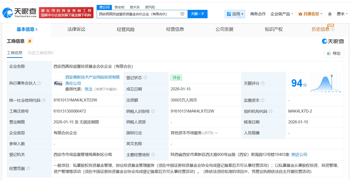 天眼查工商信息显示,近日,西安西高投益慧投资基金合伙企业(有限合伙)成立,执行事务合伙人为西安高新技术产业风险投资有限责任公司,出资额约3亿人民币,经营范围为私募股权投资基金管理、创业投资基金管理服务,以私募基金从事股权投资、投资管理、资产管理等活动。合伙人信息显示,该基金由西安奕材(688783)、西安市创新投资基金合伙企业(有限合伙)、西安市高新区合创未来投资合伙企业(有限合伙)、西安高新技术产业风险投资有限责任公司共同出资。