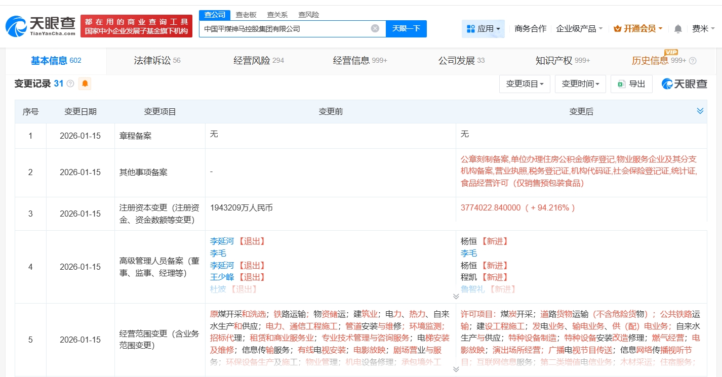 天眼查工商信息显示,近日,中国平煤神马控股集团有限公司发生工商变更,注册资本由约194.3亿人民币增至约377.4亿人民币,增幅约94%,同时,多位主要人员发生变更。