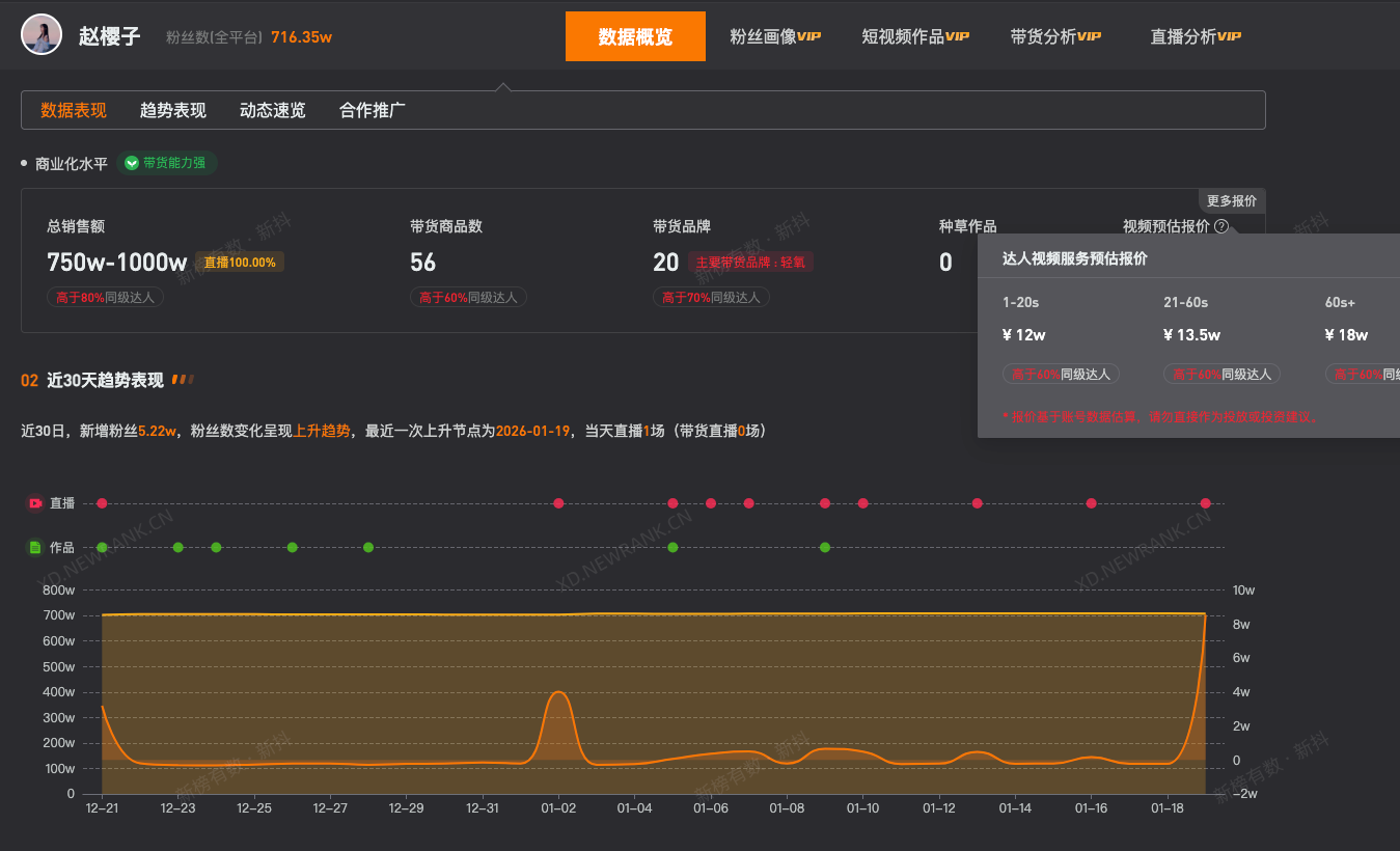 第三方数据显示,赵樱子视频平台近30日涨粉5.22万。商业化水平显示,其1-20s、21-60s、60s以上视频广告报价分别为12万、13.5万、18万。