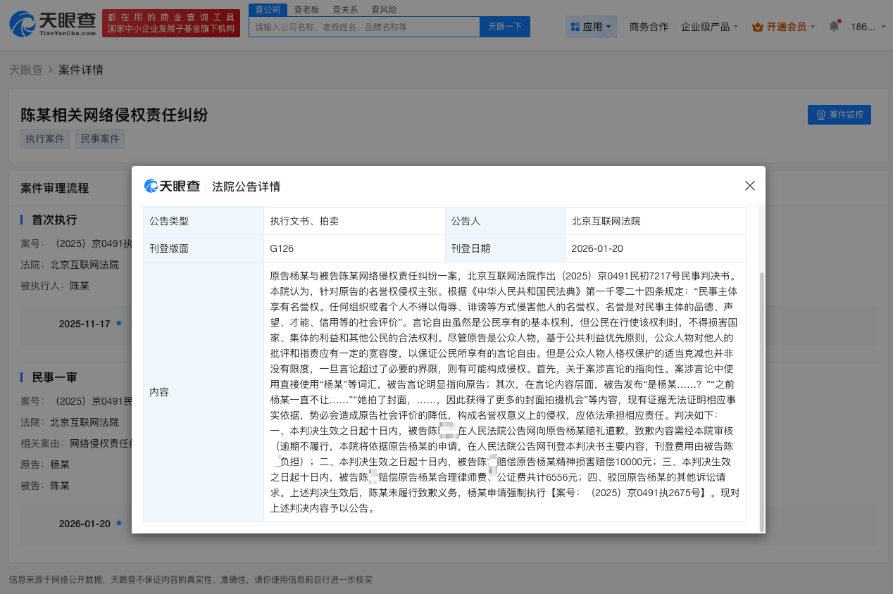 天眼查法律诉讼信息显示,近日,北京互联网法院刊登原告杨紫与被告陈某网络侵权责任纠纷一案民事判决书。法院认为,关于案涉言论的指向性。案涉言论中直接使用“杨紫”等词汇,被告言论明显指向原告;在言论内容层面,被告发布的部分内容,现有证据无法证明相应事实依据,势必会造成原告社会评价的降低,构成名誉权意义上的侵权,应依法承担相应责任。判决陈某向原告杨紫公开赔礼道歉,赔偿杨紫精神损害赔偿等合计1.6万余元。上述判决生效后,陈某未履行致歉义务,杨紫申请强制执行。