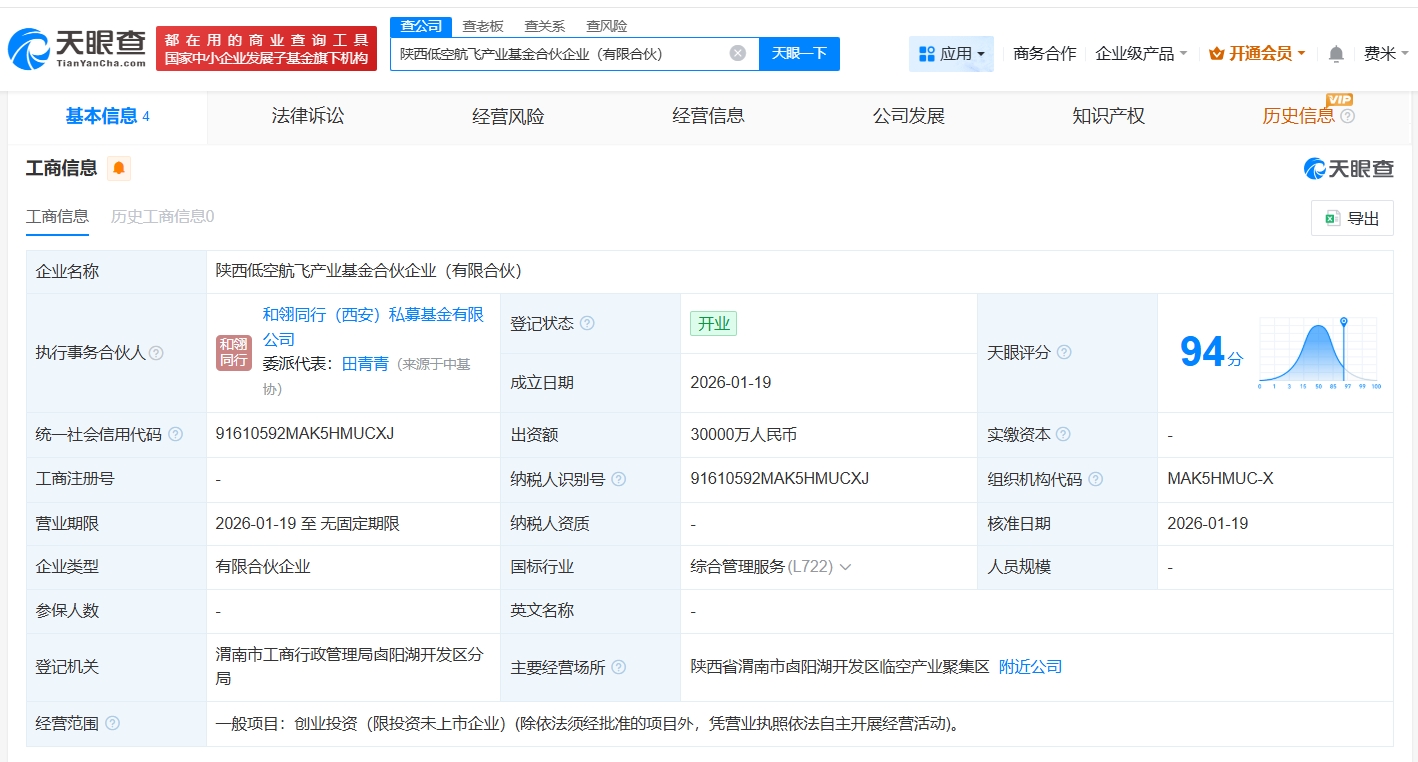 天眼查工商信息显示,近日,陕西低空航飞产业基金合伙企业(有限合伙)成立,执行事务合伙人为和翎同行(西安)私募基金有限公司,出资额3亿人民币,经营范围为创业投资,由陕西省政府投资引导基金合伙企业(有限合伙)、渭南市工业倍增发展基金(有限合伙)、和翎同行(西安)私募基金有限公司、西安和翎航装投资合伙企业(有限合伙)共同出资。