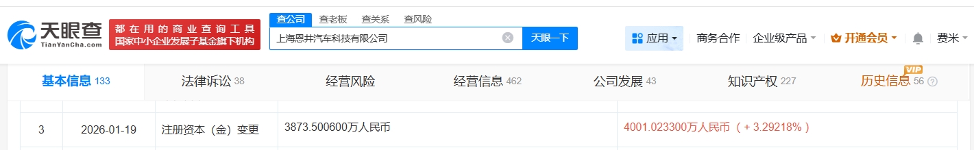 天眼查工商信息显示,近日,上海恩井汽车科技有限公司发生工商变更,新增北汽旗下北京安鹏科创汽车产业投资基金合伙企业(有限合伙)、扬州经济技术开发区临芯产业投资基金合伙企业(有限合伙)等为股东,同时,注册资本由约3873.5万人民币增至约4001万人民币。