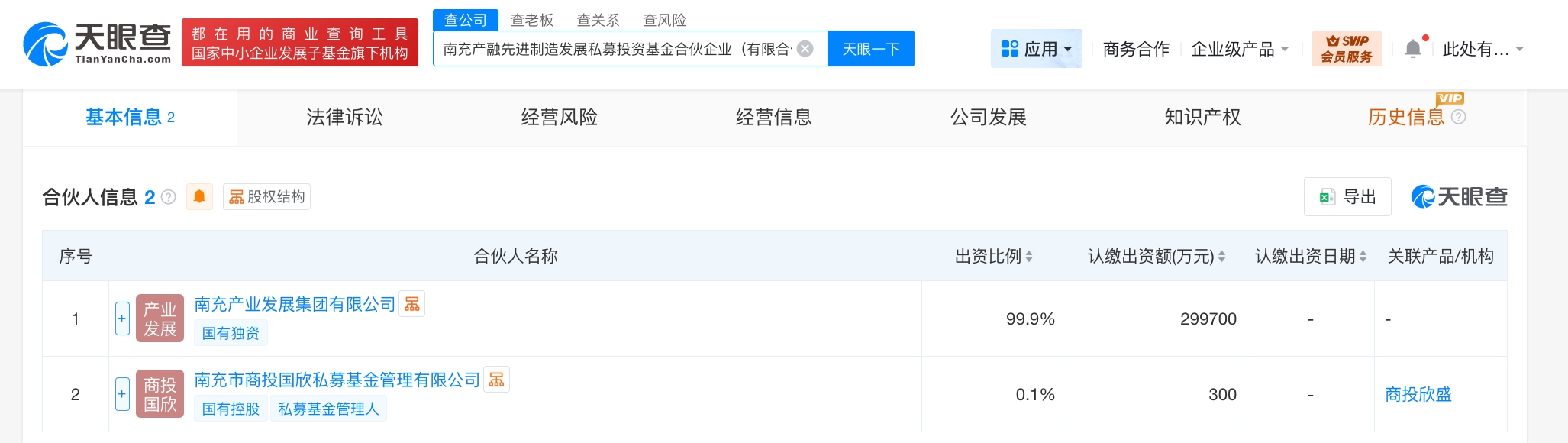 天眼查工商信息显示,近日,南充产融先进制造发展私募投资基金合伙企业(有限合伙)成立,执行事务合伙人为南充市商投国欣私募基金管理有限公司,出资额30亿人民币,经营范围为以私募基金从事股权投资、投资管理、资产管理等活动。合伙人信息显示,该基金由南充产业发展集团有限公司、南充市商投国欣私募基金管理有限公司共同出资。