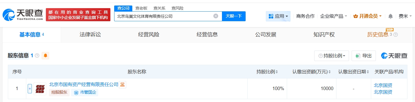 天眼查工商信息显示,近日,北京鸟巢文化体育有限责任公司成立,法定代表人为相军,注册资本1亿人民币,经营范围包括体育场地设施经营、组织文化艺术交流活动、体育竞赛组织、体育赛事策划等。股东信息显示,该公司由北京市国有资产经营有限责任公司全资持股。