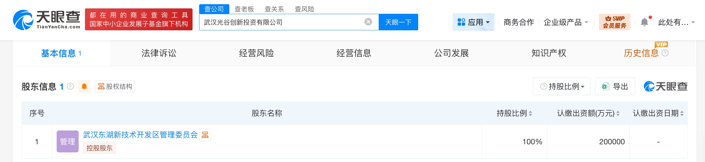 天眼查工商信息显示,近日,武汉光谷创新投资有限公司成立,法定代表人为杨少丹,注册资本20亿人民币,经营范围为以自有资金从事投资活动,自有资金投资的资产管理服务、创业投资。股东信息显示,该公司由武汉东湖新技术开发区管理委员会全资持股。