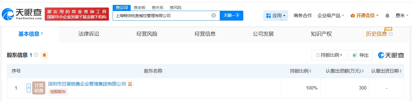 天眼查工商信息显示,1月22日,上海畅快吃鱼餐饮管理有限公司成立,法定代表人为王玉朋,注册资本300万人民币,经营范围包括餐饮管理、厨具卫具及日用杂品零售、计算机软硬件及辅助设备零售、日用百货销售等。股东信息显示,该公司由探鱼关联公司深圳市甘棠明善企业管理集团有限公司全资持股。