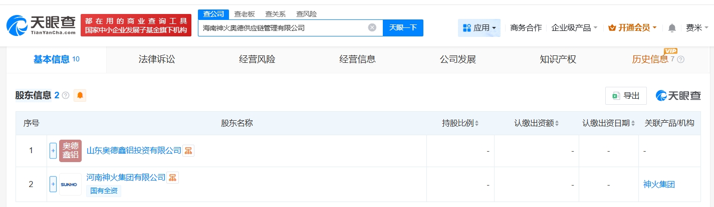 天眼查工商信息显示,近日,海南神火奥德供应链管理有限公司成立,法定代表人为刘超,注册资本1亿人民币,经营范围包括保税仓库经营、海关监管货物仓储服务、供应链管理服务、以自有资金从事投资活动等。股东信息显示,该公司由山东奥德鑫铝投资有限公司、河南神火集团有限公司共同持股。