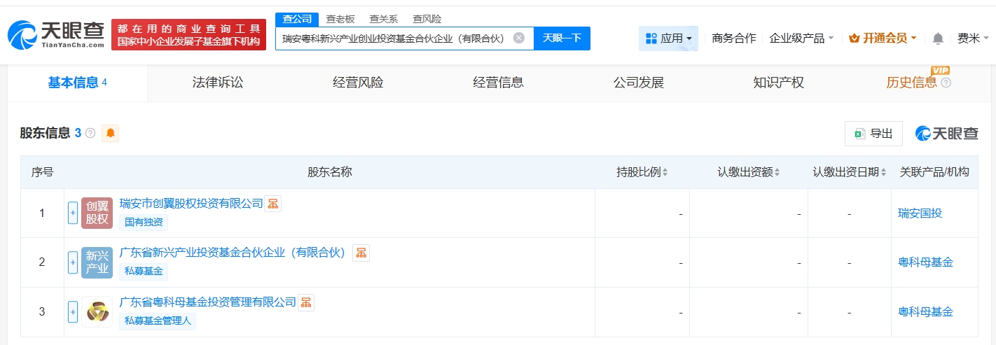 天眼查工商信息显示,近日,瑞安粤科新兴产业创业投资基金合伙企业(有限合伙)成立,执行事务合伙人为广东省粤科母基金投资管理有限公司,出资额20亿人民币,经营范围为以私募基金从事股权投资、投资管理、资产管理等活动,创业投资,由瑞安市创翼股权投资有限公司、广东省新兴产业投资基金合伙企业(有限合伙)、广东省粤科母基金投资管理有限公司共同出资。