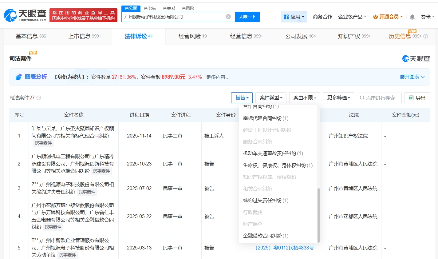 天眼查工商信息显示,涉事公司广州视源电子科技股份有限公司成立于2005年12月,法定代表人为王洋,注册资本约7亿人民币,经营范围包括技术进出口、工程和技术研究和试验发展、计算机软硬件及辅助设备批发等。股东信息显示,该公司由黄正聪、王毅然、孙永辉等共同持股。对外投资信息显示,该公司对外投资50余家企业,其中40余家处于存续状态,包括广州视源创新科技有限公司、广州视源睿创电子科技有限公司等。天眼风险信息显示,该公司曾因劳动争议,生命权、健康权、身体权纠纷被起诉。