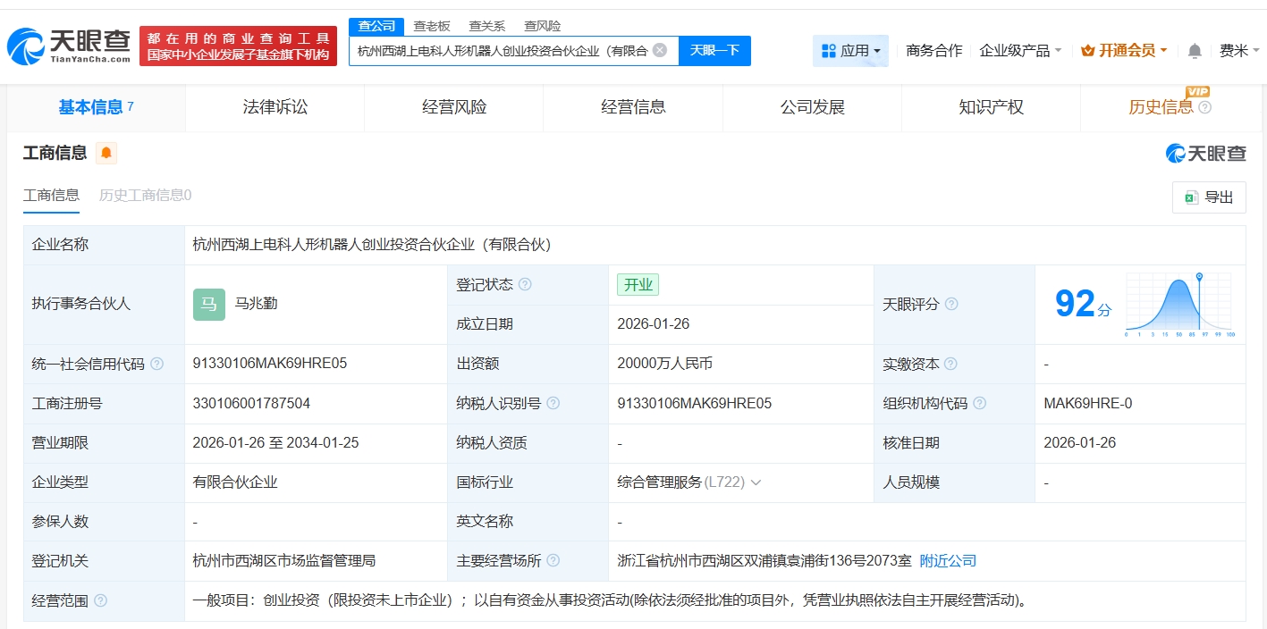 天眼查App显示,近日,杭州西湖上电科人形机器人创业投资合伙企业(有限合伙)成立,执行事务合伙人为马兆勤,出资额2亿人民币,经营范围为创业投资、以自有资金从事投资活动,由上海电器科学研究所(集团)有限公司、上海沿浦(605128)、兴瑞科技(002937)、福赛科技(301529)等共同出资。