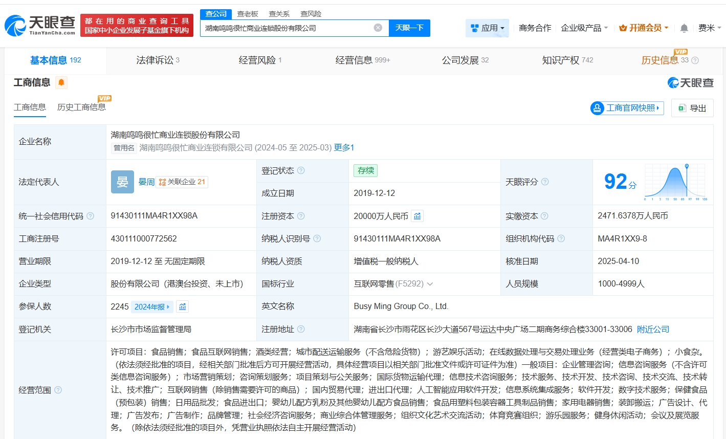 天眼查App显示,鸣鸣很忙关联公司湖南鸣鸣很忙商业连锁股份有限公司成立于2019年12月,法定代表人为晏周,经营范围包括食品销售、食品互联网销售、酒类经营等,由晏周、宜春鸟窝广告信息文化传播有限公司、李维等共同持股。变更记录显示,去年该公司发生两次增资,注册资本由约2472万人民币增至2亿人民币,此外企业名称由湖南鸣鸣很忙商业连锁有限公司变更为湖南鸣鸣很忙商业连锁股份有限公司,对外投资信息显示,该公司对外投资30余家企业,其中20余家处于存续状态。值得一提的是,2025年以来,该公司已成立杭州鸣忙供应链有限公司、西安鸣忙供应链有限公司等多家新公司。