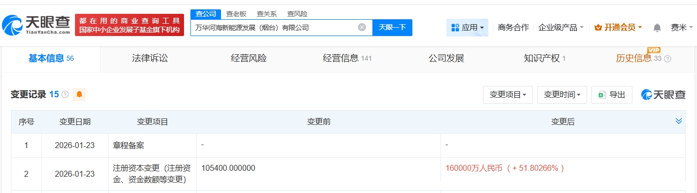 天眼查App显示,近日,万华河海新能源发展(烟台)有限公司发生工商变更,注册资本由10.54亿人民币增至16亿人民币,增幅约52%。