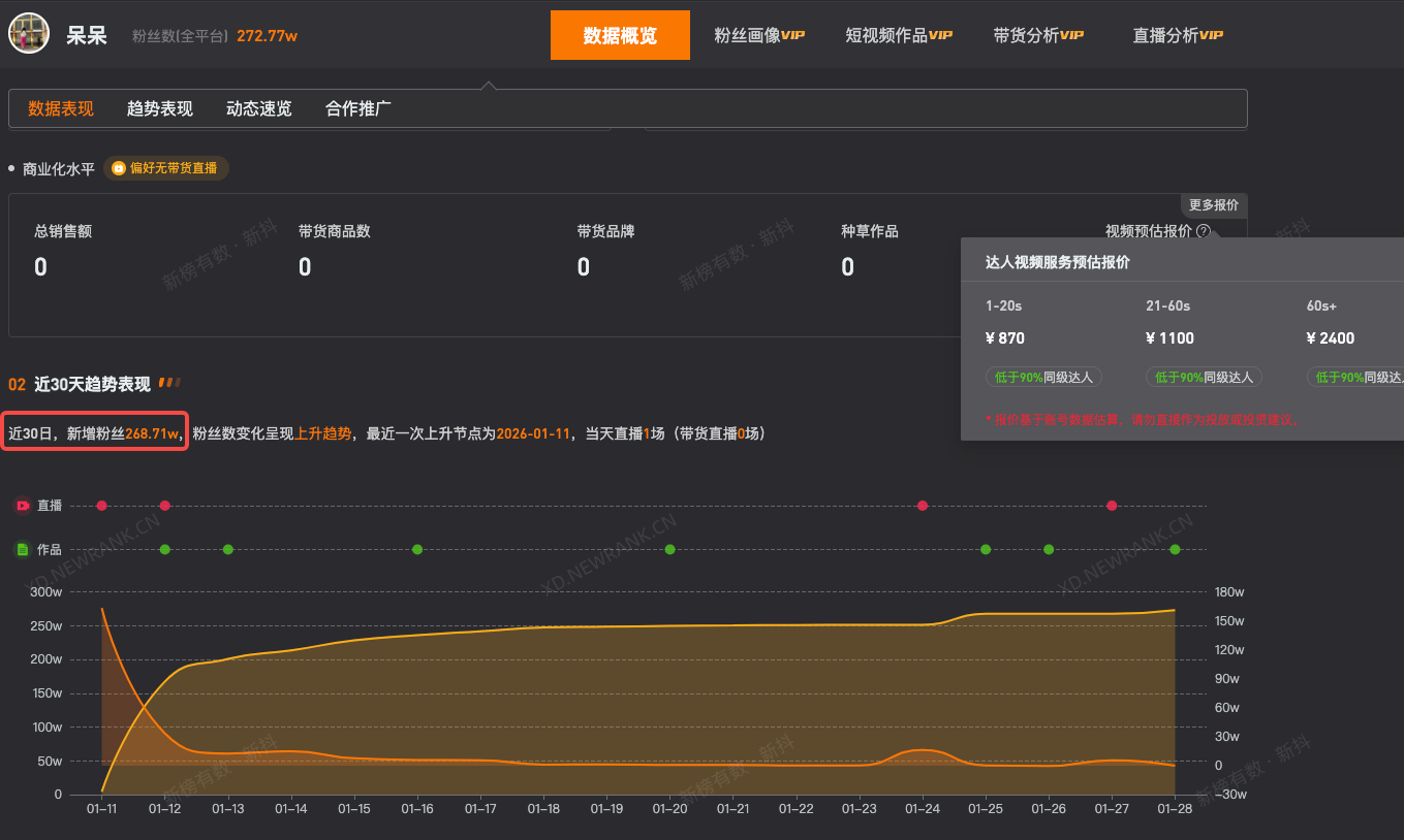 第三方数据显示,“呆呆”视频平台账号近30日涨粉268.71万。商业化水平显示,其1-20s视频预估报价为870元,21-60s视频预估报价为1100元,60s以上视频预估报价为2400元。
