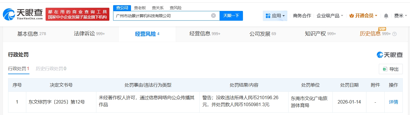 天眼查经营风险信息显示,近日,UC浏览器关联公司广州市动景计算机科技有限公司被东莞市文化广电旅游体育局没收违法所得21万余元,并处罚款105万余元。处罚事由显示,该公司未经著作权人许可,通过信息网络向公众传播其作品。