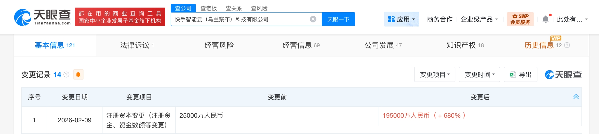 天眼查App显示,近日,快手智能云(乌兰察布)科技有限公司发生工商变更,注册资本由2.5亿人民币增至19.5亿人民币,增幅680%。