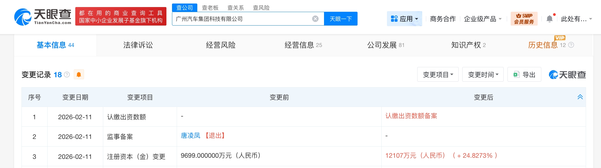 天眼查App显示,近日,广州汽车集团科技有限公司发生工商变更,注册资本由9699万人民币增至约1.2亿人民币,增幅约25%。