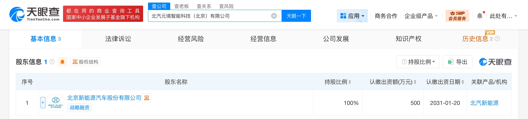 天眼查App显示,近日,北汽元境智能科技(北京)有限公司成立,法定代表人为刘观桥,注册资本500万人民币,经营范围含工程和技术研究和试验发展、物联网应用服务、人工智能基础软件开发、软件开发、汽车零部件研发等。股东信息显示,该公司由北京新能源汽车股份有限公司全资持股。