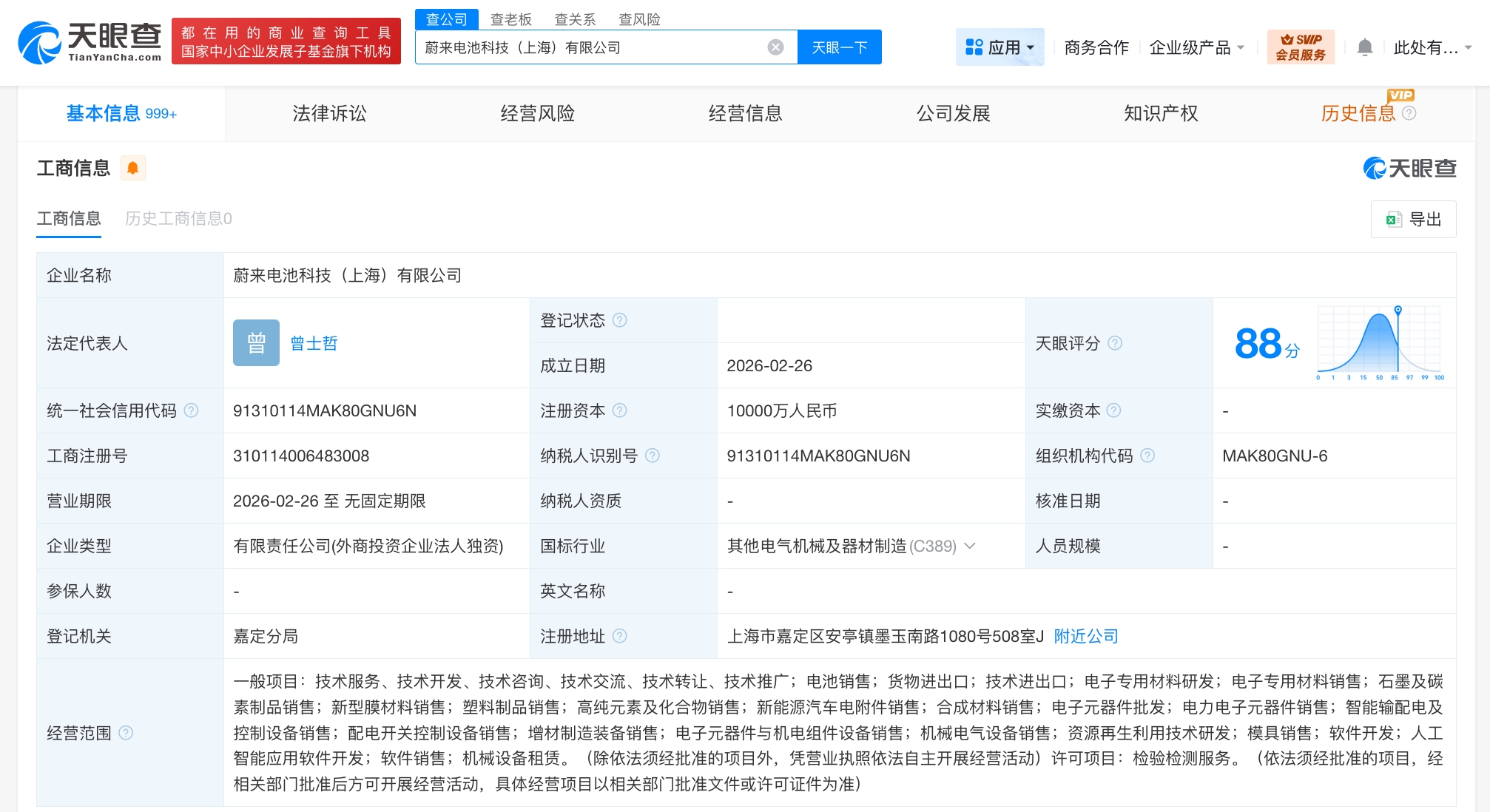 天眼查App显示,2月26日,蔚来电池科技(上海)有限公司成立,法定代表人为曾士哲,注册资本1亿人民币,经营范围含电池销售、货物进出口、技术进出口、电子专用材料销售、石墨及碳素制品销售、新型膜材料销售、新能源汽车电附件销售、电子元器件批发、智能输配电及控制设备销售、人工智能应用软件开发、检验检测服务等,由上海蔚来汽车有限公司全资持股。