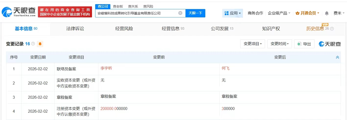 天眼查App显示,近日,安徽省科技成果转化引导基金有限责任公司发生工商变更,注册资本由20亿人民币增至30亿人民币,增幅50%。