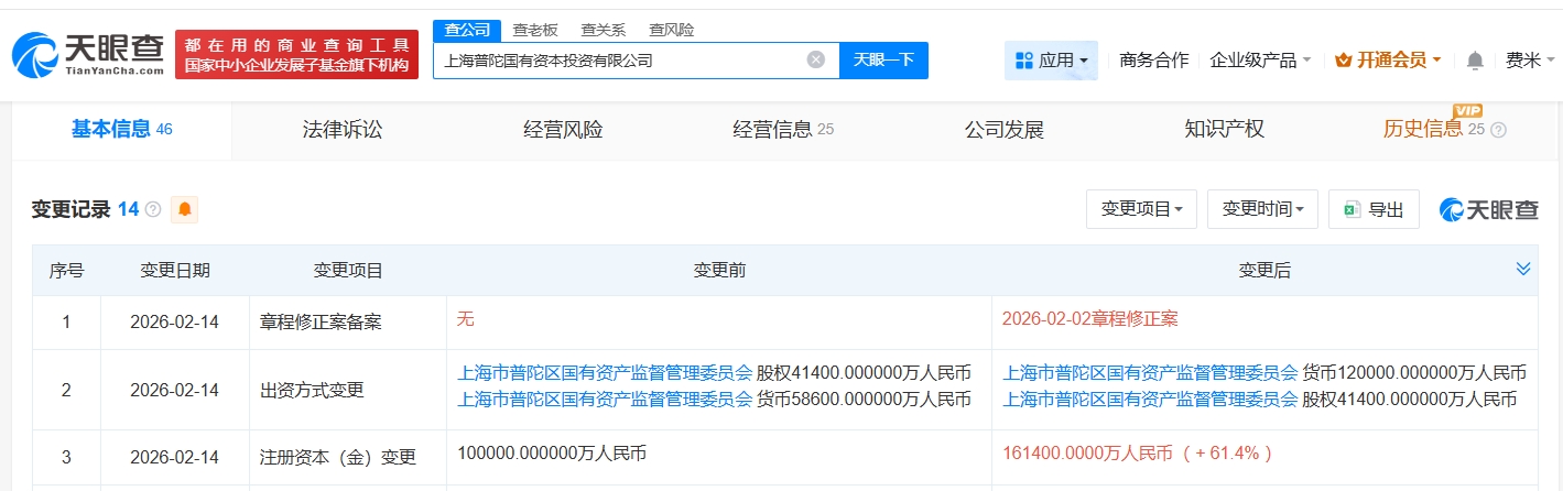天眼查App显示,近日,上海普陀国有资本投资有限公司发生工商变更,注册资本由10亿人民币增至16.14亿人民币,增幅61.4%。