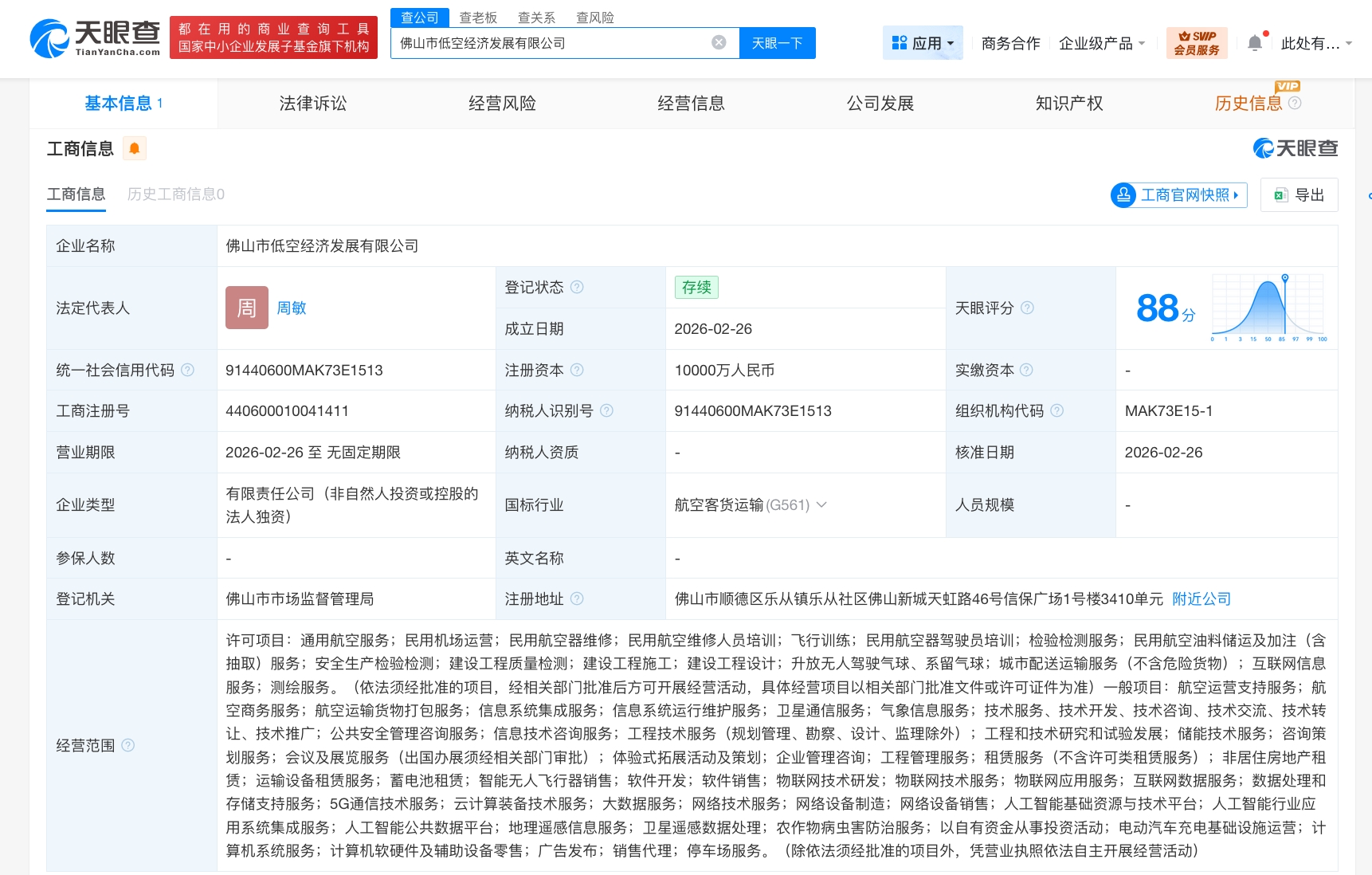 天眼查App显示,近日,佛山市低空经济发展有限公司成立,法定代表人为周敏,注册资本1亿人民币,经营范围含通用航空服务、民用机场运营、民用航空器维修、民用航空维修人员培训、飞行训练、民用航空器驾驶员培训、检验检测服务、民用航空油料储运及加注服务、互联网信息服务等,由佛山市交通投资集团有限公司全资持股。