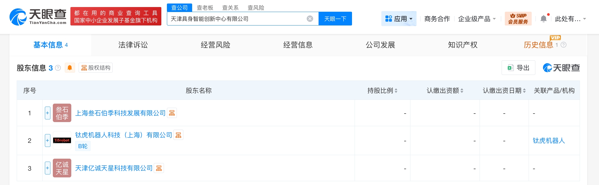 天眼查App显示,近日,天津具身智能创新中心有限公司成立,法定代表人为周磊,注册资本6000万人民币,经营范围含智能机器人的研发、智能机器人销售、服务消费机器人销售、工业机器人销售、工业机器人制造、服务消费机器人制造、信息技术咨询服务、物联网技术服务等,由钛虎机器人科技(上海)有限公司、上海叁石伯季科技发展有限公司、天津亿诚天星科技有限公司共同持股。