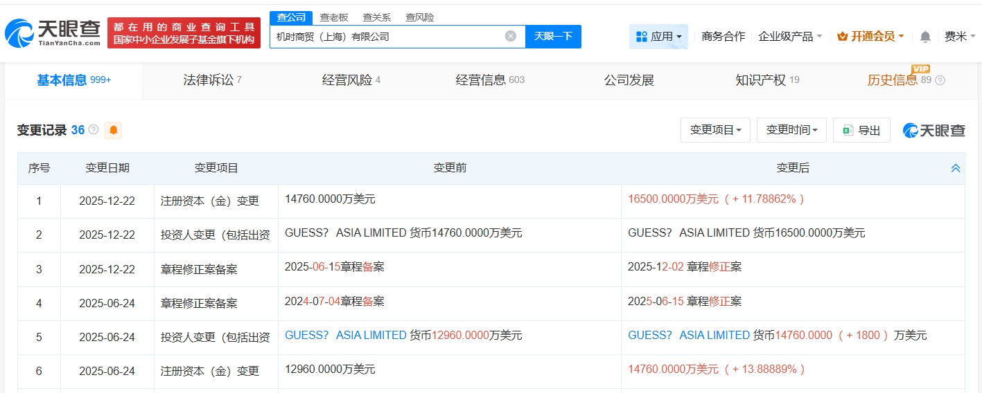 天眼查App显示,GUESS中国关联公司机时商贸(上海)有限公司成立于2007年2月,法定代表人为徐斌,注册资本1.65亿美元,经营范围包括服装、鞋帽、手表、香水、眼镜、皮具及皮制品、箱包、配饰、珠宝的批发、零售、进出口和佣金代理及相关业务咨询等,由GUESS ASIA LIMITED全资持股。变更记录信息显示,去年6月和12月,该公司曾两度增资。分支机构信息显示,该公司拥有超170家分支机构,目前仅5家处于存续状态,其余分支机构均已注销。