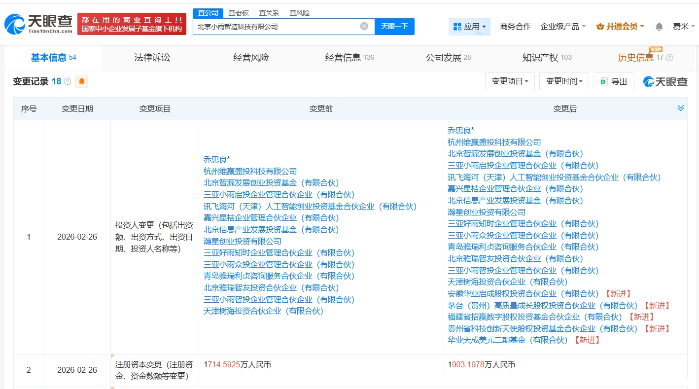 天眼查App显示,近日,北京小雨智造科技有限公司发生工商变更,新增茅台(贵州)高质量成长股权投资合伙企业(有限合伙)、福建省招赢数字股权投资基金合伙企业(有限合伙)等为股东,同时注册资本由约1714.6万人民币增至约1903.2万人民币。