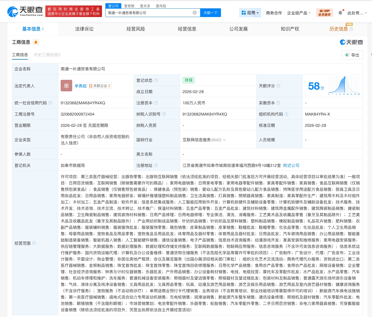 天眼查App显示,近日,南通一补通贸易有限公司成立,法定代表人为单勇超,注册资本100万人民币,经营范围含第三类医疗器械经营、出版物零售、出版物互联网销售、日用百货销售、互联网销售、家用电器销售、食品互联网销售、家用电器研发、玻璃纤维增强塑料制品销售等,由淘宝旗下淘天有限公司全资持股。