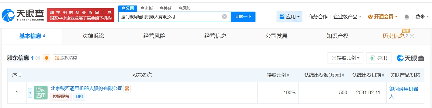 天眼查App显示,3月4日,厦门银河通用机器人有限公司成立,法定代表人为姚腾洲,注册资本500万人民币,经营范围含服务消费机器人制造、服务消费机器人销售、智能机器人的研发等。股东信息显示,该公司由北京银河通用机器人股份有限公司全资持股。