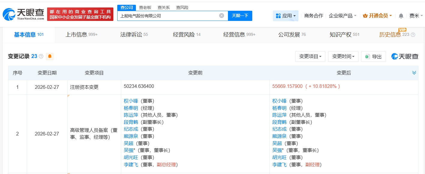 天眼查App显示,近日,上能电气(300827)发生工商变更,注册资本由约5亿人民币增至约5.6亿人民币,增幅约11%。