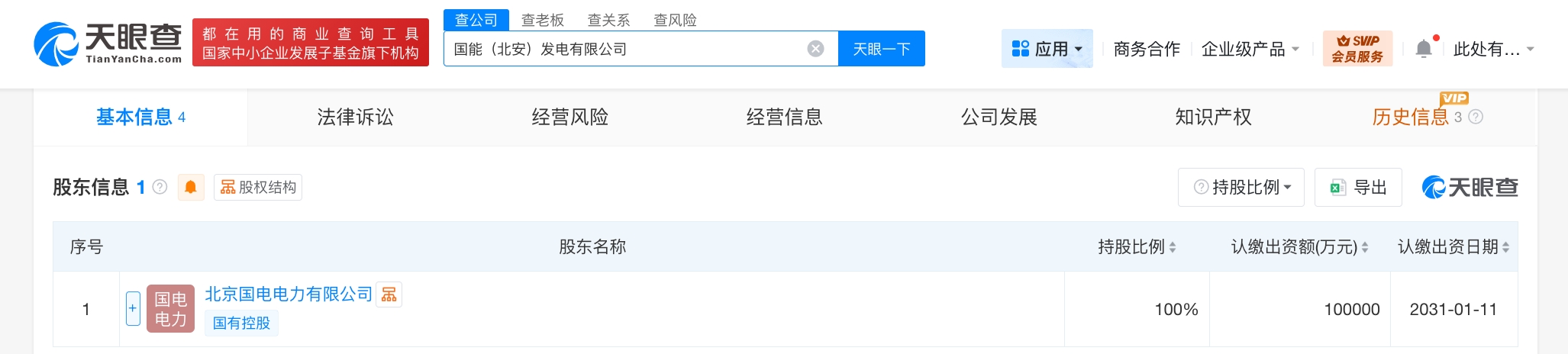 天眼查工商信息显示,近日,国能(北安)发电有限公司成立,法定代表人为王国安,注册资本10亿人民币,经营范围包括发电业务、输电业务、供(配)电业务,热力生产和供应,以自有资金从事投资活动,化工产品销售,非居住房地产租赁,储能技术服务等。股东信息显示,该公司由北京国电电力有限公司共同持股。