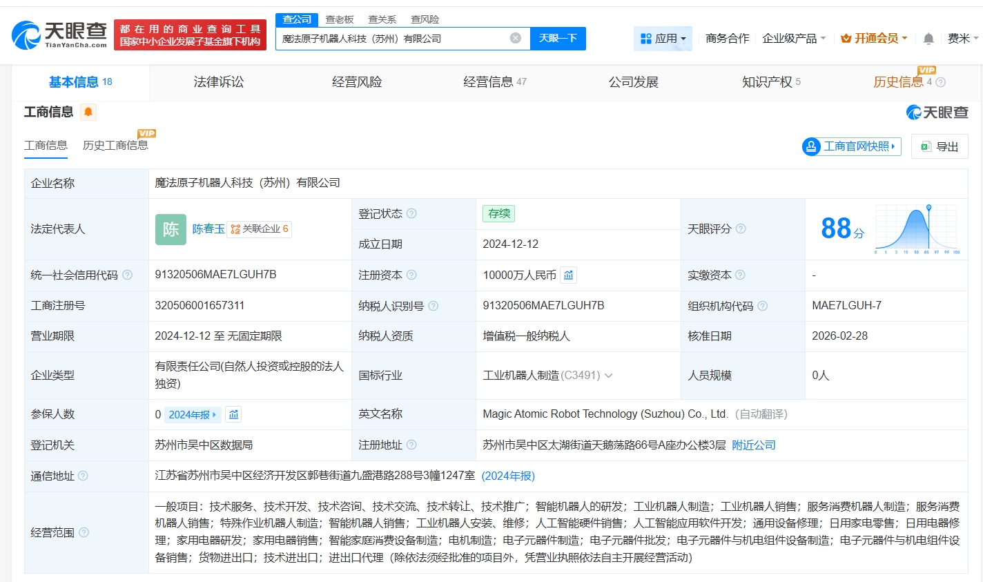 天眼查工商信息显示,近日,魔法原子机器人科技(苏州)有限公司发生工商变更,魔法原子创始人吴长征卸任法定代表人、董事,由陈春玉接任。