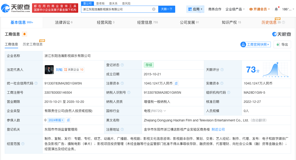 天眼查App显示,出品方浙江东阳浩瀚影视娱乐有限公司成立于2015年10月,法定代表人为刘韬,注册资本约1040万人民币,经营范围包括制作、复制、发行:专题、专栏、综艺、动画片、广播剧、电视剧等,由华谊兄弟传媒股份有限公司、杜淳、李晨、陈赫、郑恺、冯威(冯绍峰)等共同持股。