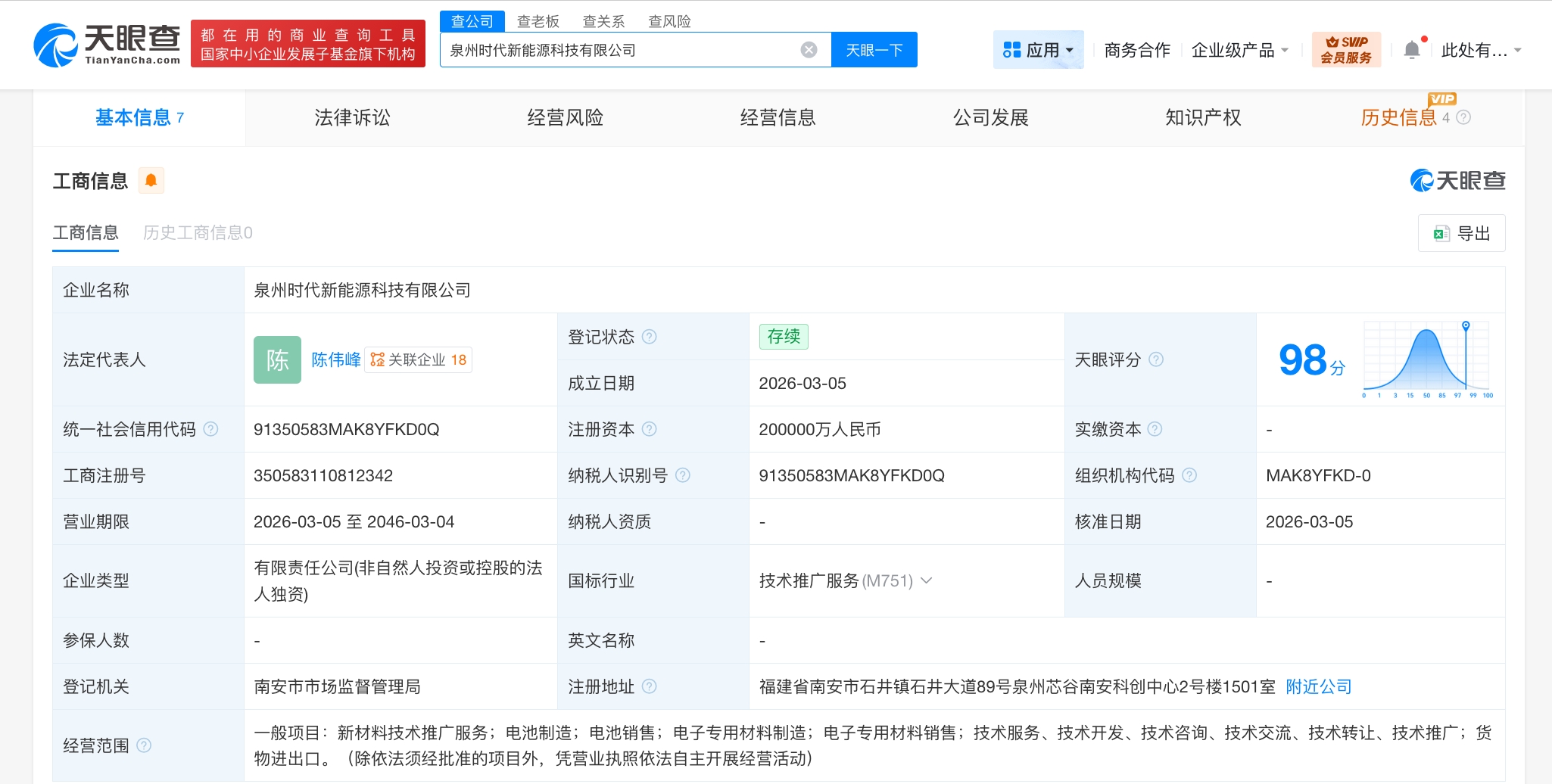 天眼查工商信息显示,近日,泉州时代新能源科技有限公司成立,法定代表人为陈伟峰,注册资本20亿人民币,经营范围为新材料技术推广服务,电池制造,电池销售,电子专用材料制造,电子专用材料销售,技术服务、技术开发、技术咨询、技术交流、技术转让、技术推广,货物进出口。股东信息显示,该公司由宁德时代(300750)全资持股。