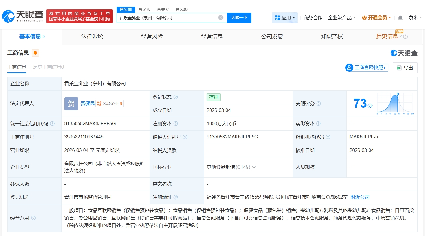 天眼查App显示,近日,君乐宝乳业(泉州)有限公司成立,法定代表人为贺健民,注册资本1000万人民币,经营范围包括食品互联网销售、食品销售、保健食品销售等。股东信息显示,该公司由君乐宝乳业集团股份有限公司全资持股。