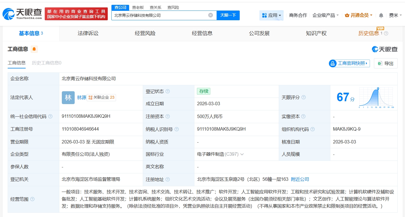 天眼查App显示,近日,北京青云存储科技有限公司成立,法定代表人为林源,注册资本500万人民币,经营范围包括人工智能应用软件开发、人工智能基础软件开发、数据处理和存储支持服务等。股东信息显示,该公司由青云科技(688316)全资持股。