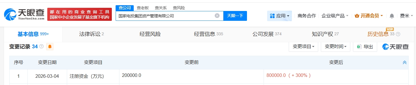 天眼查工商信息显示,近日,国家电投集团资产管理有限公司发生工商变更,注册资本由20亿人民币增至80亿人民币,增幅300%。