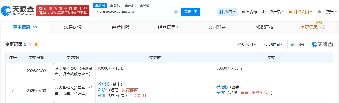 天眼查工商信息显示,近日,北京瀚海数科科技有限公司发生工商变更,注册资本由8亿人民币增至9亿人民币,增幅约13%。