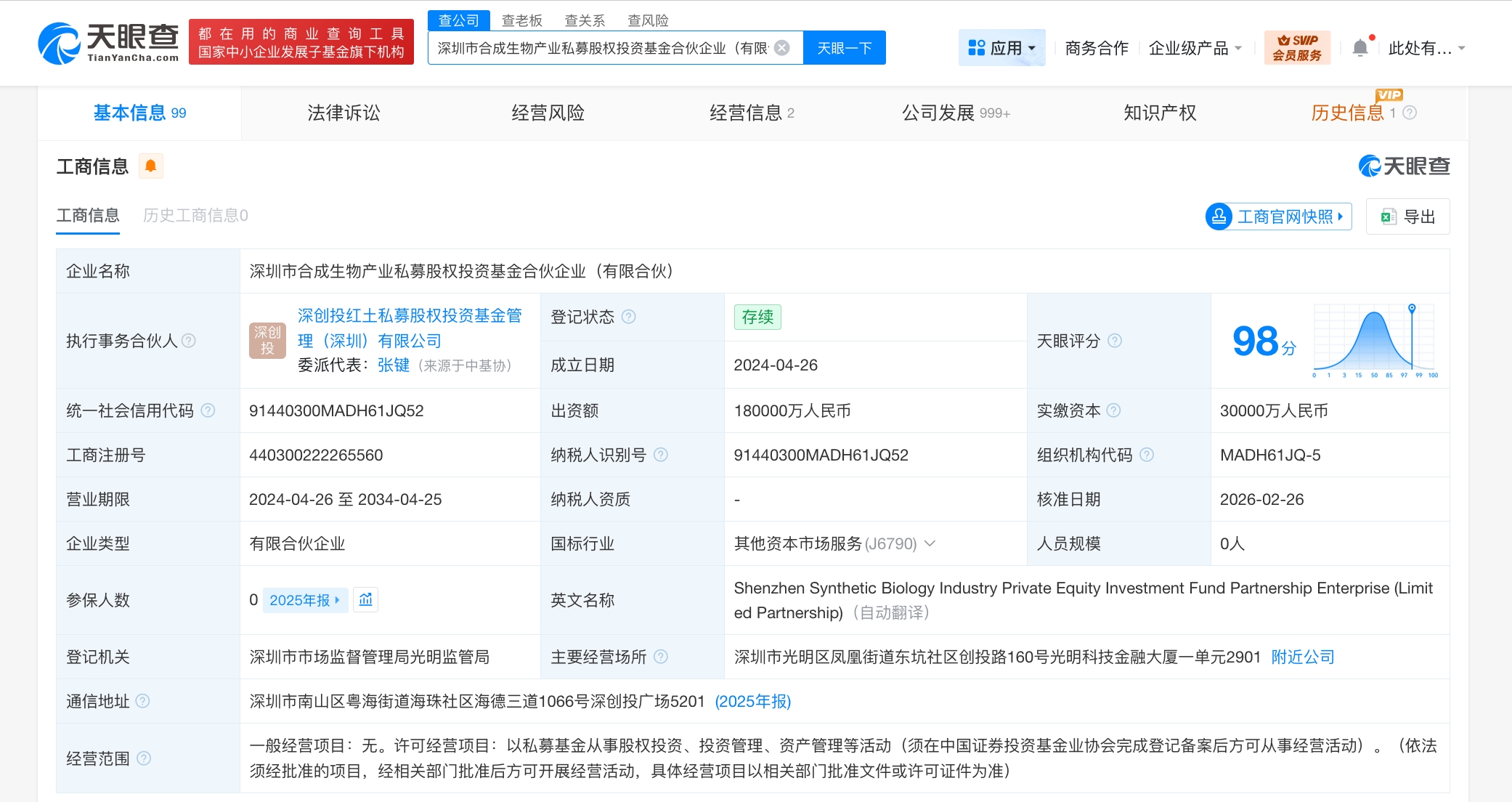 天眼查工商信息显示,近日,深圳市合成生物产业私募股权投资基金合伙企业(有限合伙)发生工商变更,出资额由15亿人民币增至18亿人民币,增幅20%。