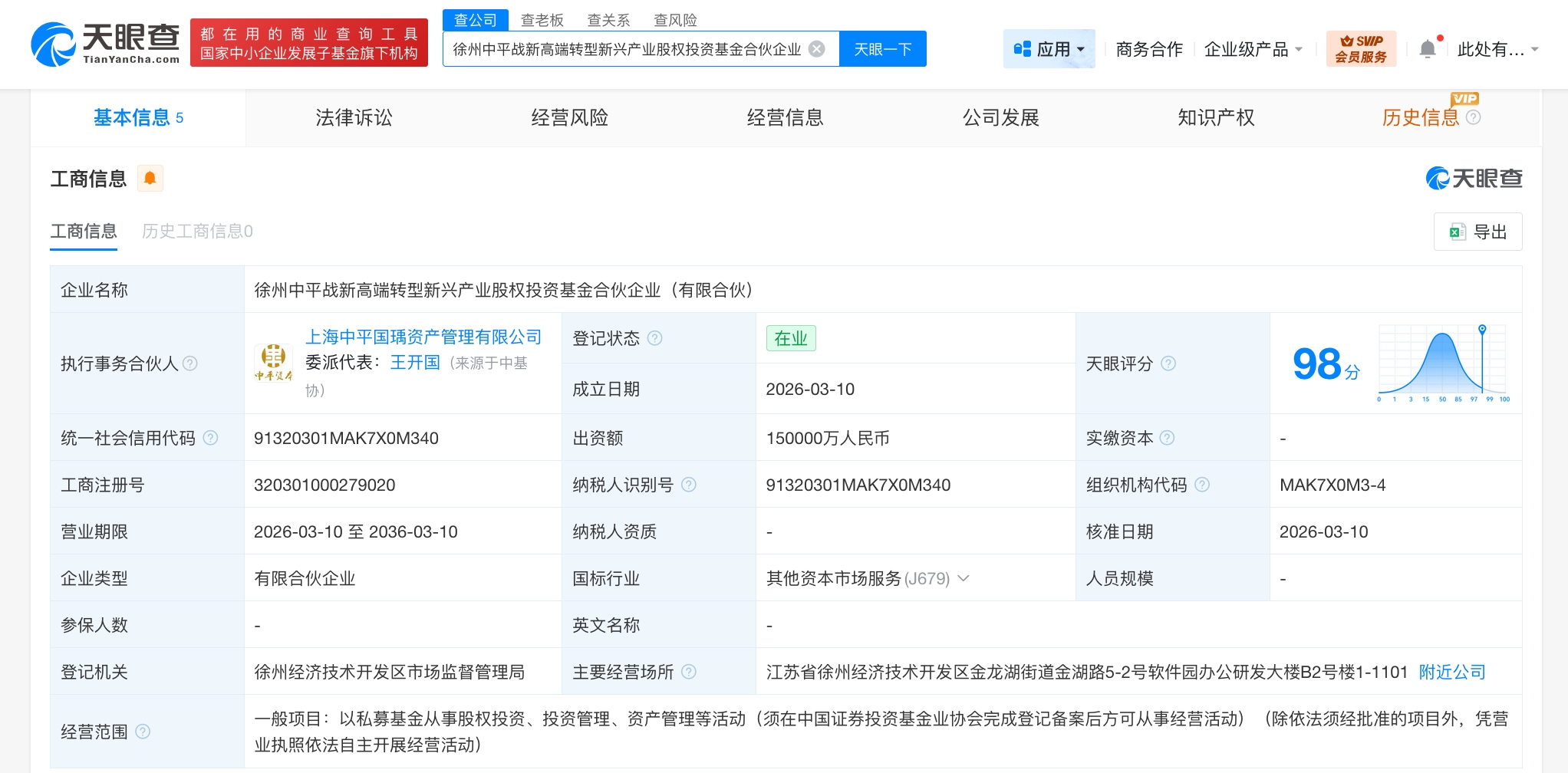 天眼查工商信息显示,近日,徐州中平战新高端转型新兴产业股权投资基金合伙企业(有限合伙)成立,执行事务合伙人为上海中平国瑀资产管理有限公司,出资额15亿人民币,经营范围为以私募基金从事股权投资、投资管理、资产管理等活动。合伙人信息显示,该基金由扬州国珺股权投资合伙企业(有限合伙)、江苏徐州新兴产业专项母基金(有限合伙)、徐州产发产业投资基金合伙企业(有限合伙)等共同出资。