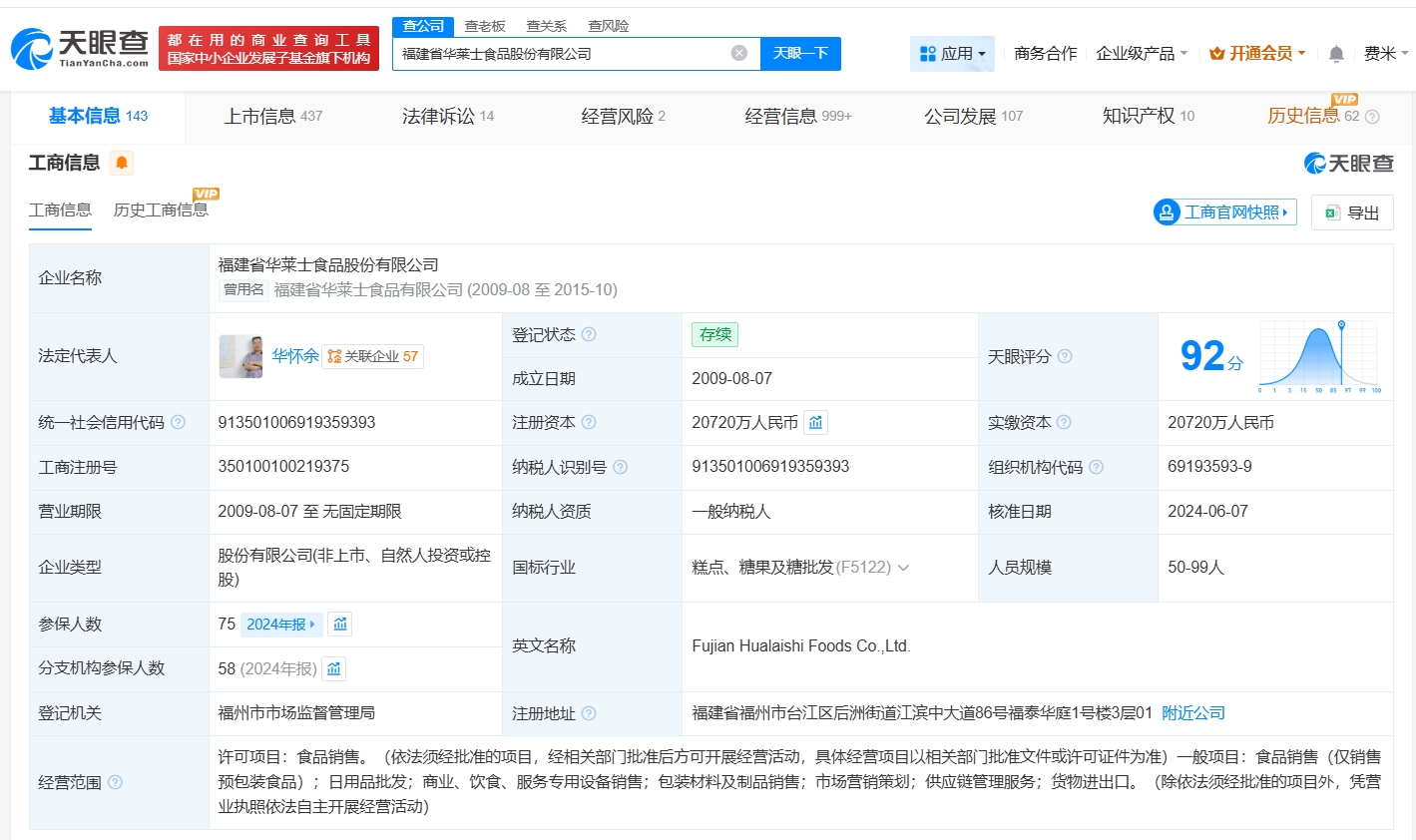 天眼查App显示,华莱士关联公司福建省华莱士食品股份有限公司成立于2009年8月,法定代表人为华怀余,注册资本约2.1亿人民币,经营范围包括食品销售、日用品批发、包装材料及制品销售等。股东信息显示,该公司由华怀余、凌淑冰、张仰枝等共同持股。对外投资信息显示,该公司对外投资22家企业,其中21家处于存续状态,包括山东新食州食品有限公司、浙江华莱士食品有限公司、福建华莱士仓储有限公司等。