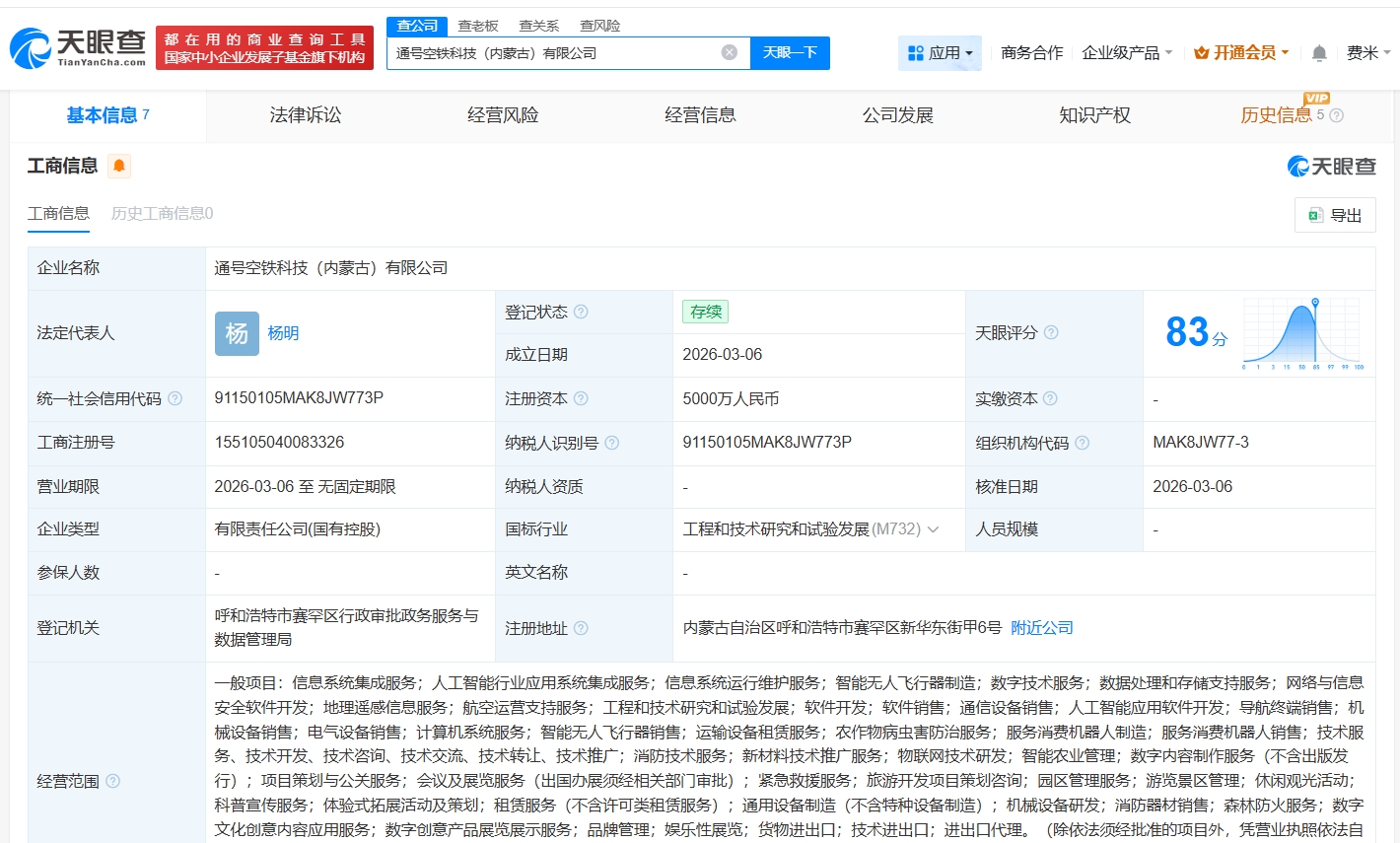 天眼查App显示,近日,通号空铁科技(内蒙古)有限公司成立,法定代表人为杨明,注册资本5000万人民币,经营范围包括信息系统集成服务、智能无人飞行器制造、航空运营支持服务、人工智能应用软件开发等。股东信息显示,该公司由中国通号(688009)旗下通号低空智能科技有限公司、内蒙古交通投资(集团)有限责任公司共同持股。
