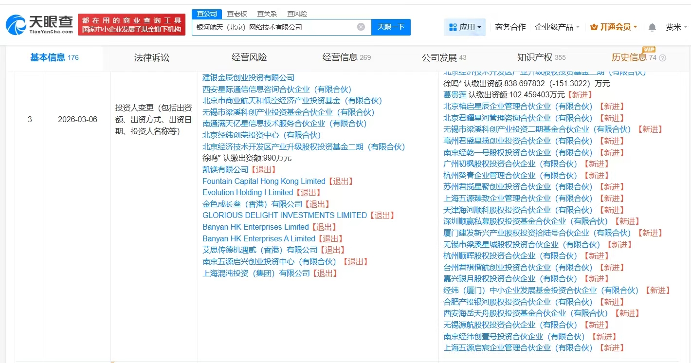 天眼查工商信息显示,近日,银河航天(北京)网络技术有限公司发生工商变更,原股东凯镁有限公司、上海混沌投资(集团)有限公司等退出,新增顺为资本旗下天津海河顺科股权投资合伙企业(有限合伙)、北京榕启星辰企业管理合伙企业(有限合伙)等为股东。