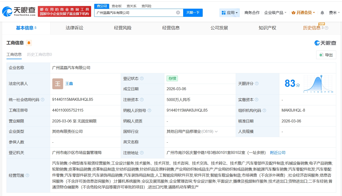 天眼查App显示,近日,广州蓝晶汽车有限公司成立,法定代表人为王鑫,注册资本5000万人民币,经营范围包括新能源汽车整车销售、道路机动车辆生产、人工智能应用软件开发等。股东信息显示,该公司由广汽集团(601238)旗下广汽商贸有限公司、广州黑晶投资合伙企业(有限合伙)共同持股。