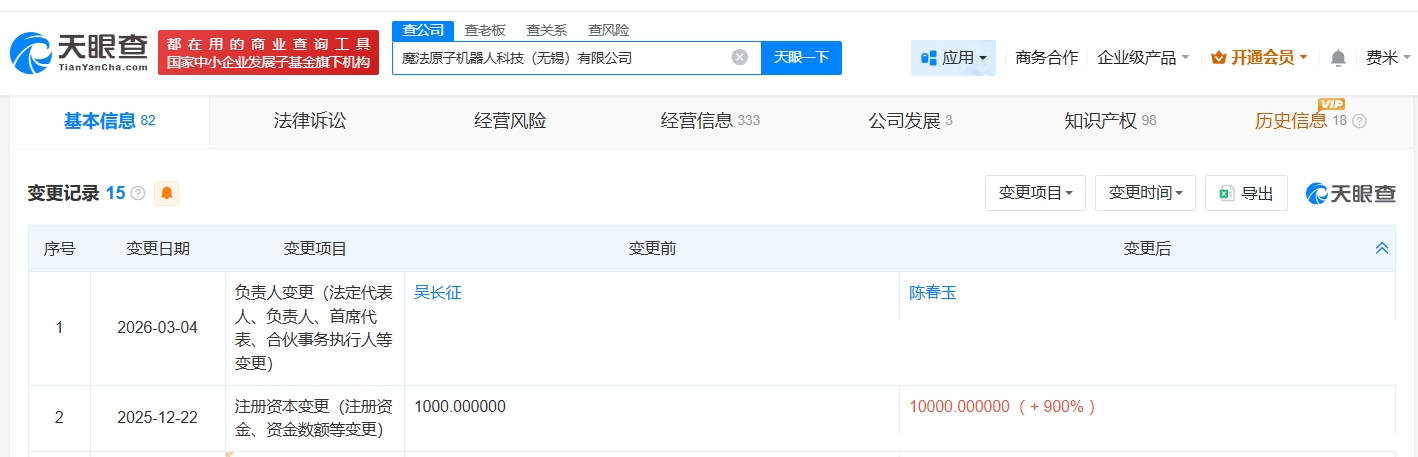 天眼查工商信息显示,魔法原子机器人关联公司魔法原子机器人科技(无锡)有限公司成立于2023年12月,经营范围包括智能机器人的研发、工业机器人制造、工业机器人销售等。股东信息显示,该公司由魔法工场(无锡)科技有限公司全资持股。变更记录显示,近期,该公司发生工商变更,创始人吴长征卸任法定代表人,由陈春玉接任。去年12月,该公司注册资本由1000万人民币增至1亿人民币。对外投资信息显示,该公司对外投资8家企业,去年10月以来,该公司成立了魔法工场机器人科技(宜宾)有限公司、魔法原子机器人科技(武汉)有限公司、魔法原子机器人科技(杭州)有限公司。